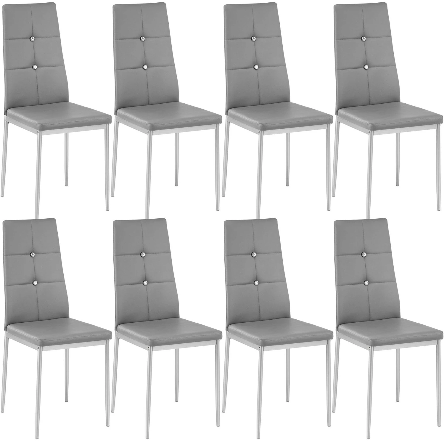 Setze einen stilvollen Akzent in Deiner Küche mit diesem 4er Set Esszimmerstühle von tectake. Die Sitzgruppe verbindet ein schickes Erscheinungsbild mit praktischen Eigenschaften. Ein hoher Sitzkomfort, ein strapazierfähiges Kunstleder und eine einfache Reinigung zeichnen diese Hochlehner aus. Trotz der schlanken Form und des geringen Gewichts sind die Polsterstühle äußerst stabil und belastbar. Der Eyecatcher sind natürlich die beidseitig eingearbeiteten Steine in Diamantenoptik, die dem Designer-Stuhl den besonderen Touch geben. Auch außerhalb des Essbereichs macht der Sitz eine gute Figur und lädt zum Verweilen ein. Bringe trendbewusstes Design in Deine vier Wände mit dem 4er Set Esszimmerstühle von tectake.