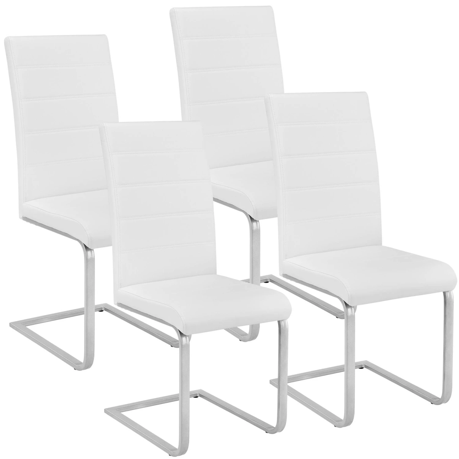 Mit diesem 4er Set Schwingstühle von tectake holst Du Dir eine zeitlos schöne Sitzgruppe in Deine Küche, Deinen Wohn- oder Arbeitsbereich. Auch in einem Café oder in einer Praxis sind die formschönen, bequemen Hochlehner ein Blickfang. Die Freischwinger sind gut verarbeitet, strapazierfähig sowie leicht und einfach zu reinigen – ideal auch für den turbulenten Familienalltag. Der geschwungene Fuß aus mattem Stahl garantiert einen festen Stand und harmoniert perfekt mit dem Kunstlederbezug. Die gepolsterte Rückenfläche unterstützt durch ihre Form ein aufrechtes Sitzen auf angenehme Weise. Elegantes Erscheinungsbild, ansprechendes Design, hoher Sitzkomfort: Das 4er Set Schwingstühle von tectake setzt jeden Raum gekonnt in Szene.