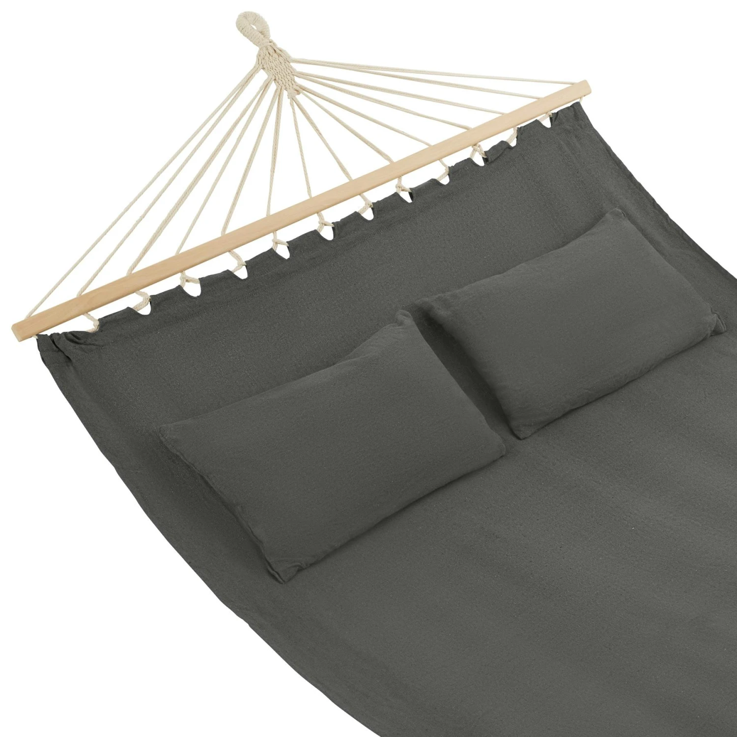 Genieße Momente voller Entspannung in der einladenden Hängematte von tectake. Eine hochwertige Mischung aus Baumwolle und Polyester macht die rückenschonende Liegefläche sowohl äußerst anschmiegsam, als auch extrem strapazierfähig. Die Spreizstäbe aus Birkenholz am unteren und oberen Ende halten das Tuch unter Spannung und ermöglichen so einen leichten Ein- und Ausstieg. Dank dem großzügigen Platzangebot und den beiden weichen Kissen lässt es sich in der gemütlichen Mehrpersonen-Hängematte auch ganz bequem zu zweit einkuscheln.