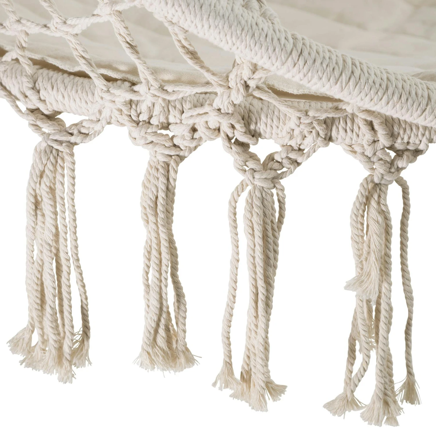 Schwebe entspannt über dem Alltagsstress im bequemen Hängesessel von tectake. Das leichte Baumwollgeflecht und das weiche Sitzkissen des Hängesitzes passen sich der Form Deines Körpers perfekt an. Neben dem Komfort bietet die robuste Korbschaukel mit den Zierquasten an der Unterseite auch eine ansprechende Optik für ein noch größeres Wohlgefühl. Durch sein geringes Gewicht lässt sich der robuste Hängestuhl fast überallhin mitnehmen. Genieße ein spannendes Buch oder einen guten Rotwein beschwingt mitten in der Natur im kuscheligen Hängesessel von tectake.